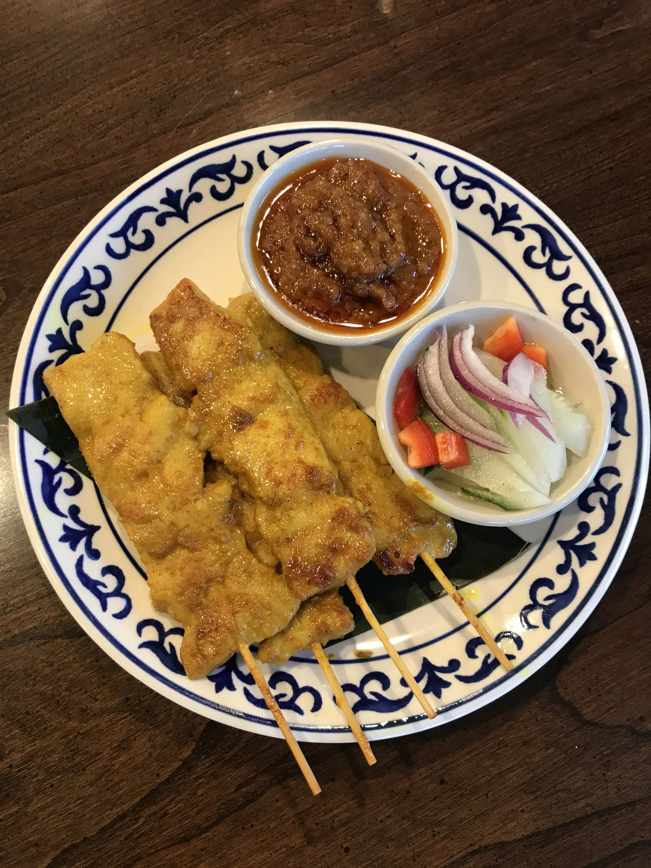 add cucumber relish for $1: Four grilled chicken marinated with karee powder, turmeric and coconut milk on skewers, served with peanut sauce